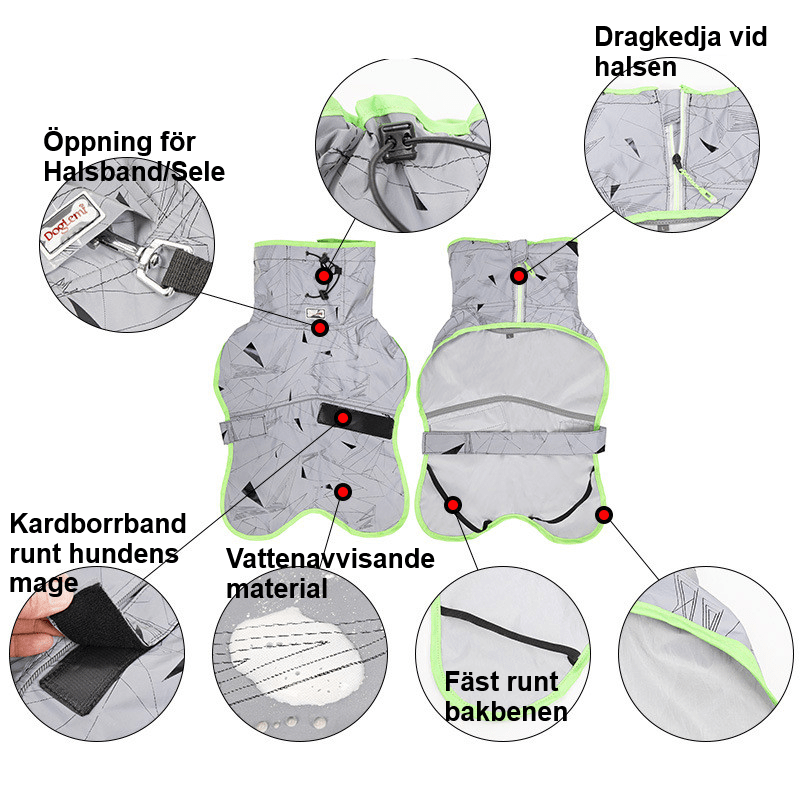 Vårt reflektäcke är vattenavvisande och fungerar som en regnjacka under regniga kvällar. Dessutom är det enkelt att sätta på och anpassa till din hund med hjälp av kardborrebandet.