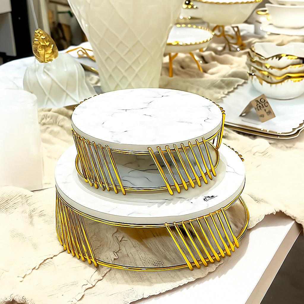 Ett dekorativt tårtställ av trä med metalldetaljer. Passar utmärkt vid ett speciellt firande eller ett kalas. Vårt fantastiska tårtställ är mångsidigt nog att passa både för fina tillställningar och vardaglig dukning. Oavsett om du vill förgylla en speciell fest eller bara skapa en extra touch av elegans i vardagen, är detta tårtställ den perfekta lösningen. Med sin stilfulla design och användbarhet är det en funktionell och vacker tillägg till ditt kök